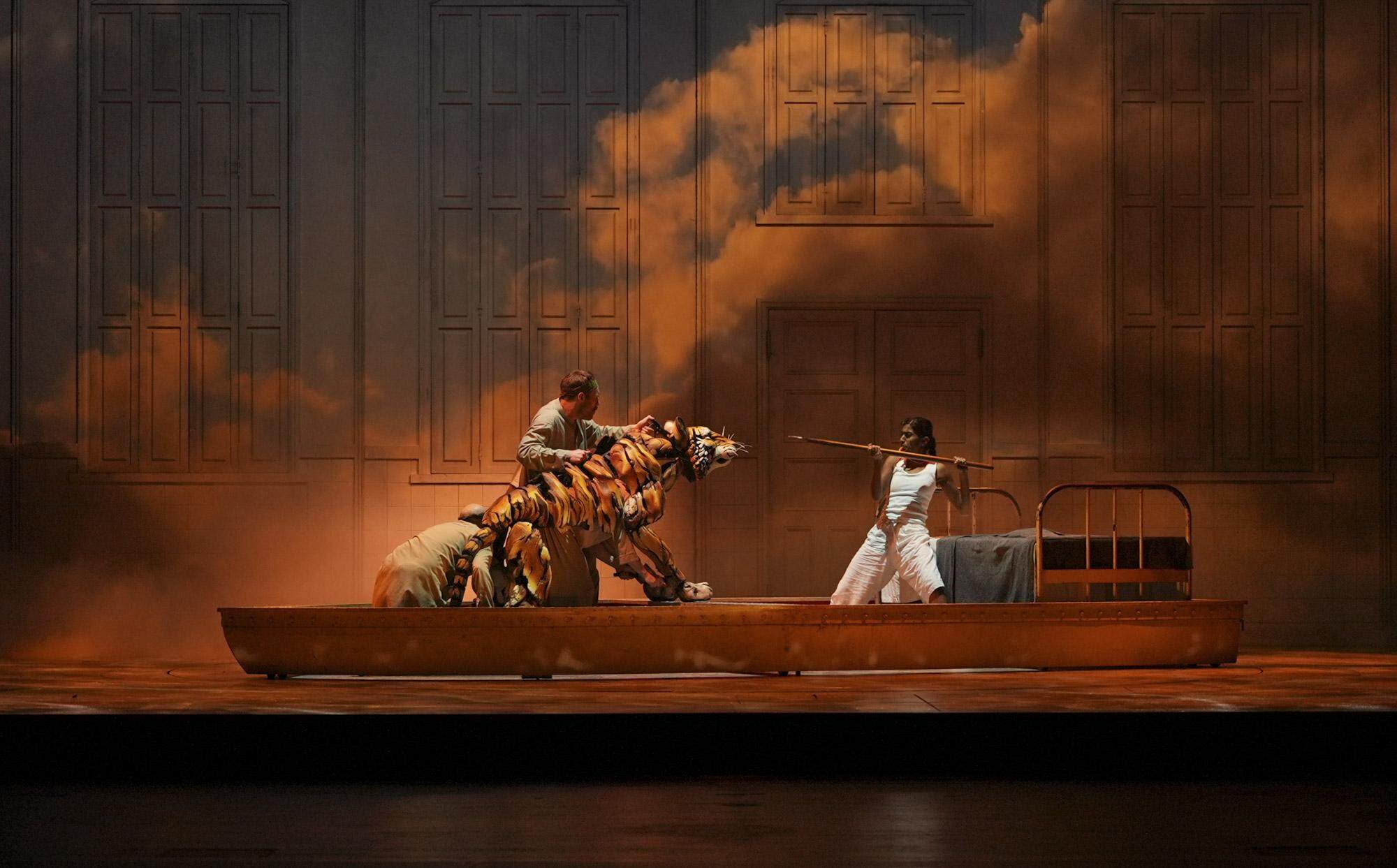 话剧《少年派的奇幻漂流》中最大亮点莫过于以“偶戏”重塑动物角色——孟加拉虎“理查德·帕克”由三位操偶师精密操控,它的每一个呼吸和动作都被赋予了野性和生命力,鬣狗、猩猩、斑马等角色亦通过人偶互动焕发灵魂。操偶师与道具浑然一体,以呼吸般的细腻动作传递情绪,令无生命的偶具在暴风雨中咆哮、战栗,英国《卫报》赞誉其为“令人叹为观止的木偶艺术”。